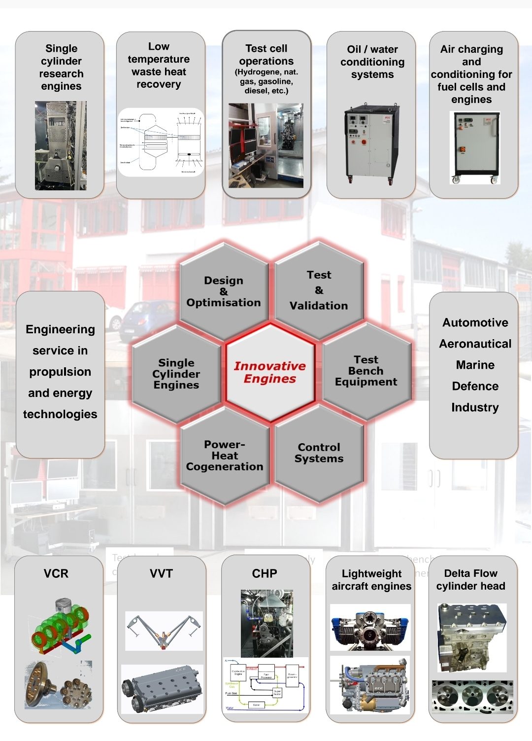 Einen weiteren Arbeitsbereich stellen die Herstellung von Test und Prüfanlagen für Verbrennungsmotoren und sonstige Energieanlagen dar.