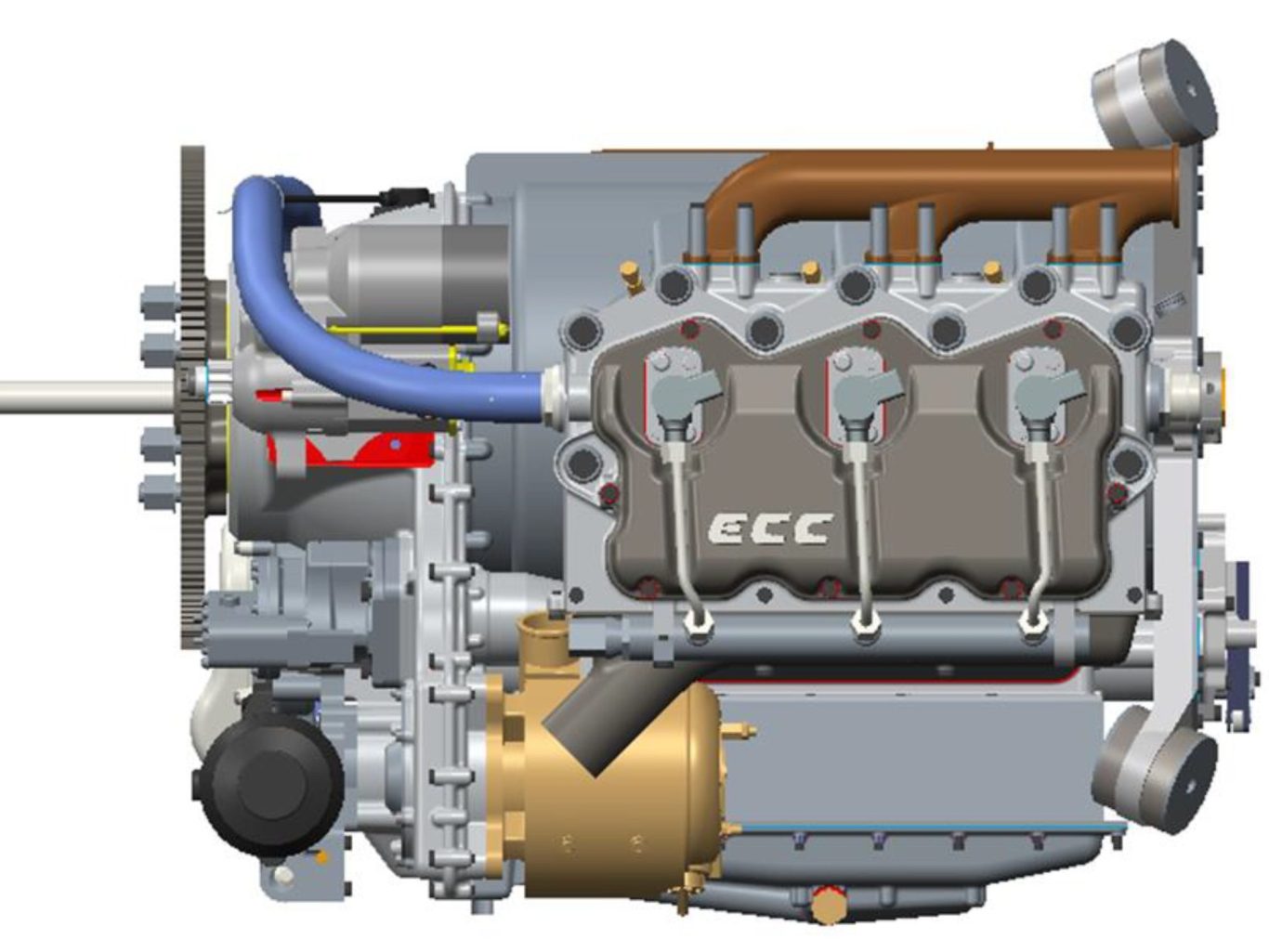 Für den Einsatz in Kleinflugzeugen (leichte Luftsportgeräte) und Überwachungsdrohnen, hat die ECC einen besonders leichten Viertakt-Flugmotor entwickelt. Der Motor zeichnet sich als Inline-Boxermotor durch einen besonders ruhigen lauf (vollständiger Massenausgleich) und ein extrem niedriges Leistungsgewicht aus. Mit integriertem Propellergetriebe wiegt der Motor ledig 16 kg ohne 12,5 kg. Die Leistung ist abhängig vom eingesetzten Kraftstoff (Flüssiggas, Benzin, zukünftig auch Kerosin) und beträgt bis zu 22 KW. Das Leistungsgewicht de Motors macht ihn zu einer umweltfreundlichen Alternative zu Zweitaktmotoren in den Anwendungen bei denen Viertaktmotoren aufgrund des höheren Leistungsgewichts schwer vordringen konnten. Um niedrige Lärmemissionen und eine lange Lebensdauer zu erreichen arbeitet der Motor mit einer für Kleinmotoren sehr niedrigen Drehzahl von 4500 U/min. Die Kombination von niedriger Nenndrehzahl und Leistungsgewicht konnte durch eine Kurbelgehäuseaufladung realisiert werden.